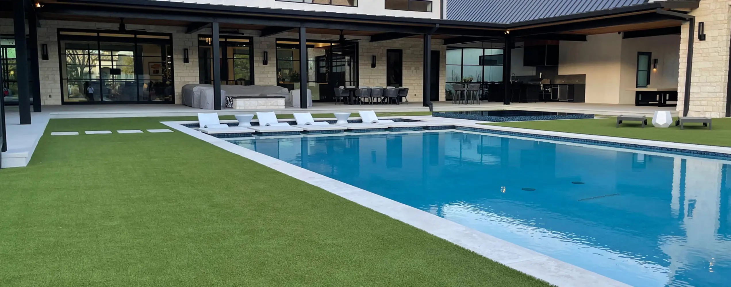 residential artificial grass lawn with lounge chairs
